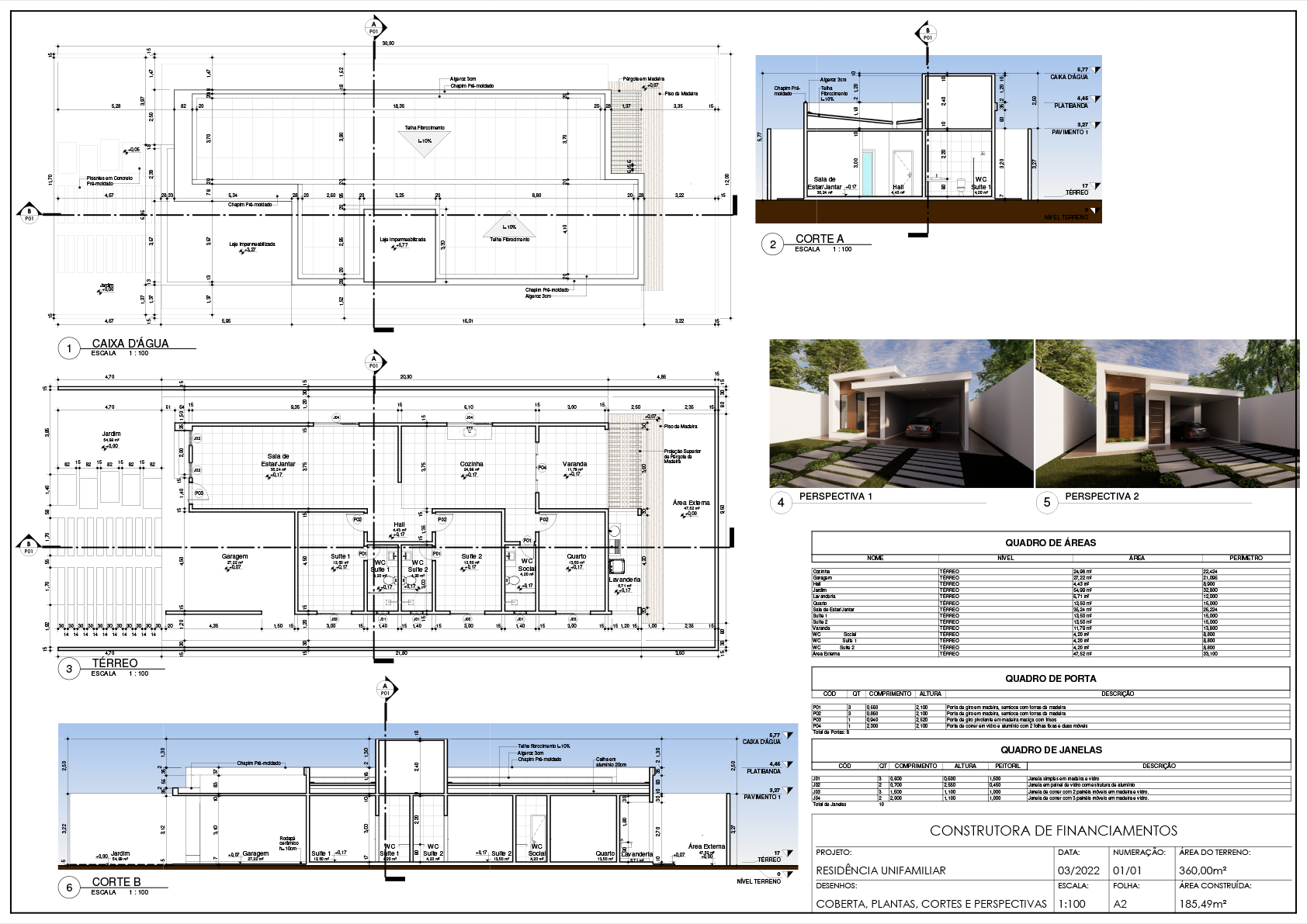 Desenho – Coberta, plantas, cortes e perspectivas com área construída de 185,49 m2